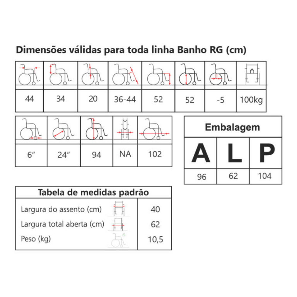 • Construída em aço • Pintura eletrostática epóxi • Rodas traseiras de 24″ com pneus maciços • Apoios para pés articuláveis, removíveis e reguláveis em altura • Apoios para braços removíveis • Freios bilaterais • Largura do assento 40cm • Capacidade para 100 Kg